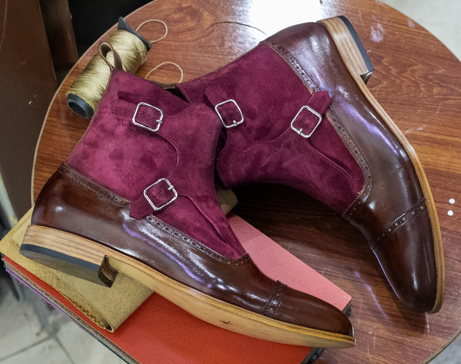 Double Buckle Style New Stylish Leather Suede Brown and Cordovan Color Cap Toe Boots for Men's