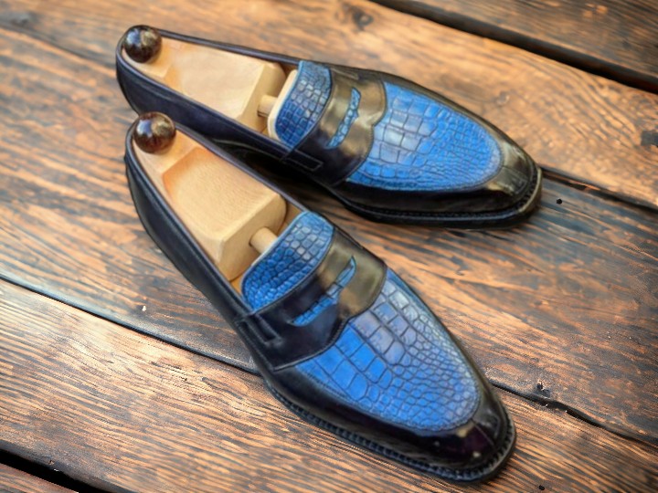 Handmade Men's Black and Blue Leather Shoes ,Alligator Texture Penny Loafer Shoes