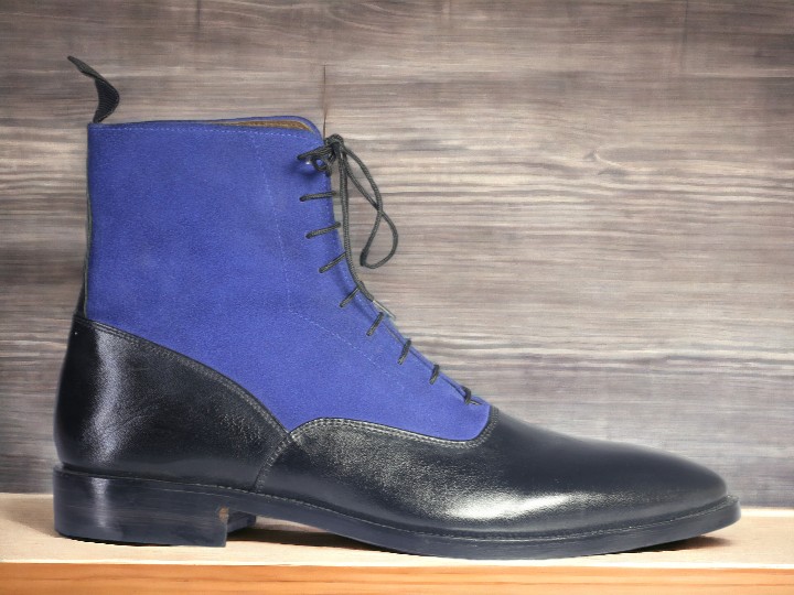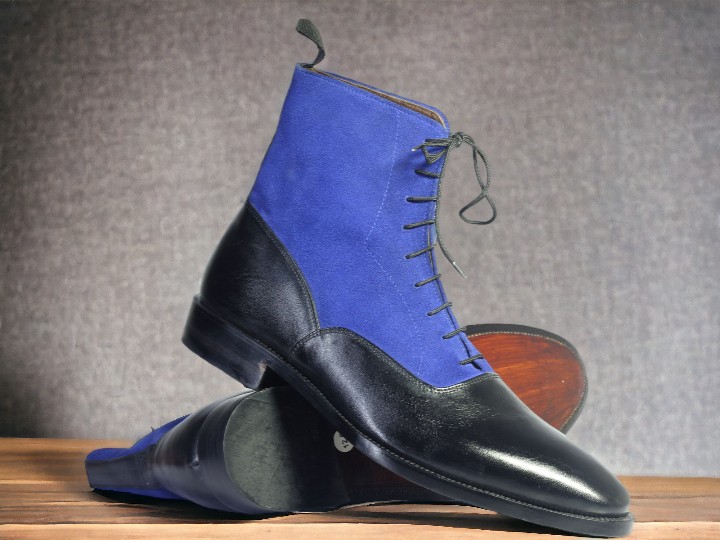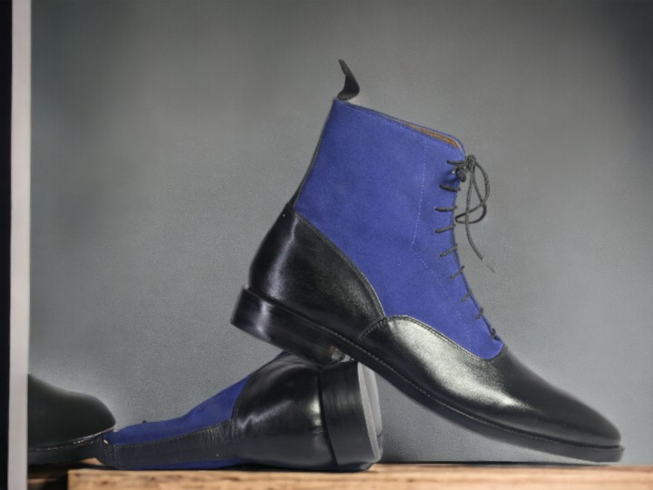 Handmade Men's Black and blue leather and Suede Boot ,Ankle High Lace Up Boot