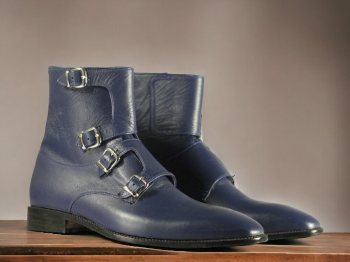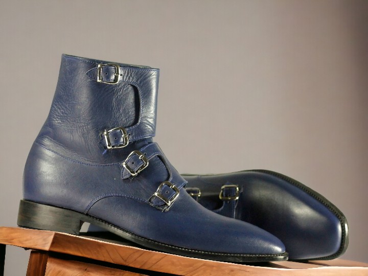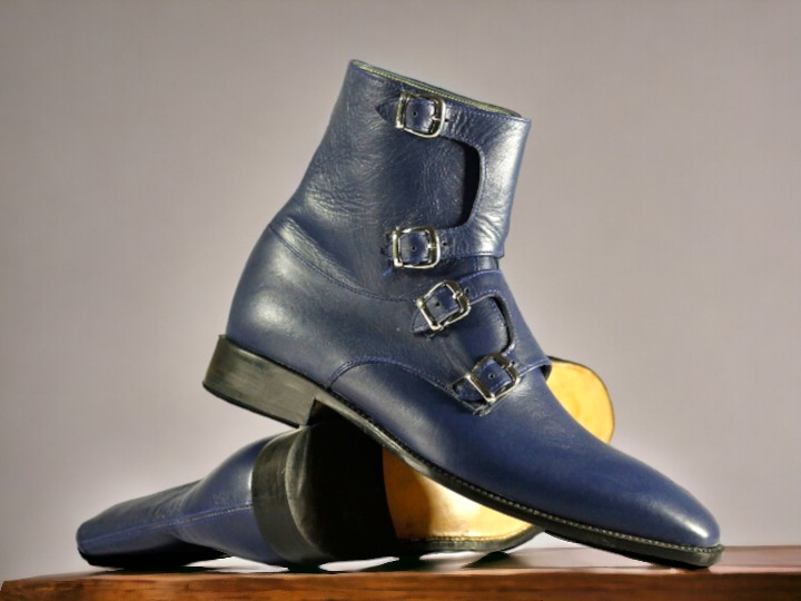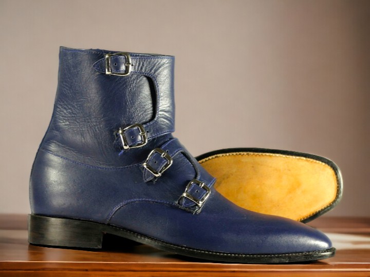 Handmade Men's Blue Leather Boot ,Quad Buckle Ankle High Boot