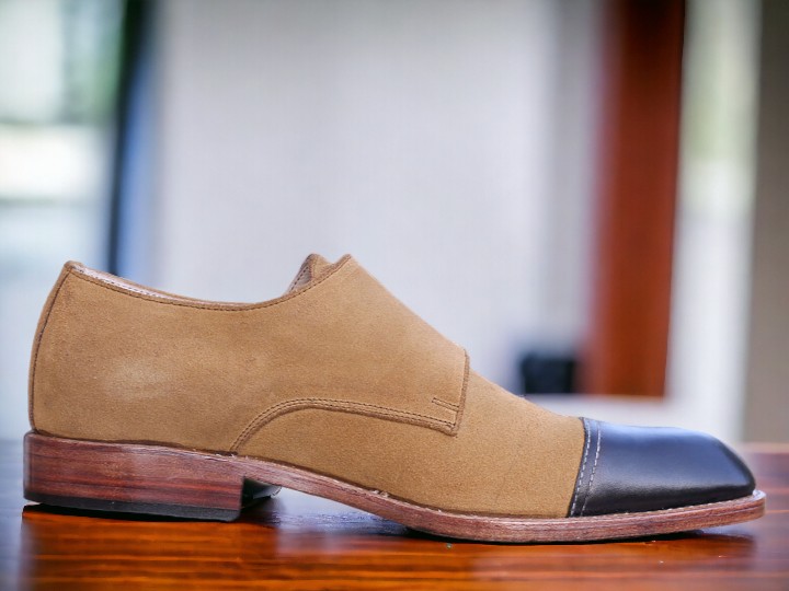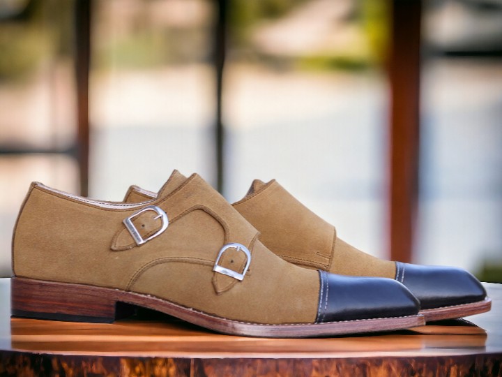 Handmade Men's Tan And Black Leather and Suede Shoes ,Cap Toe Double Buckle Shoes