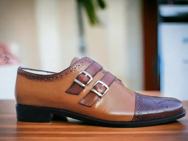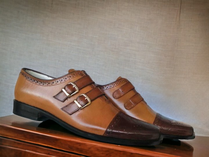 Handmade men's brown and black leather shoes ,cap toe brogue double buckle shoes