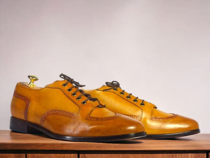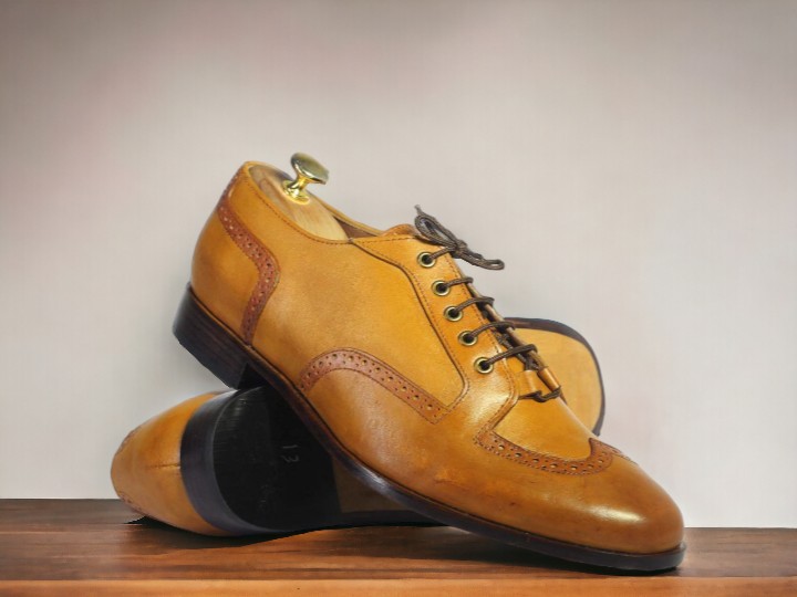 Handmade Men's Tan Leather Shoes ,Wing Tip Lace Up Dress Shoes