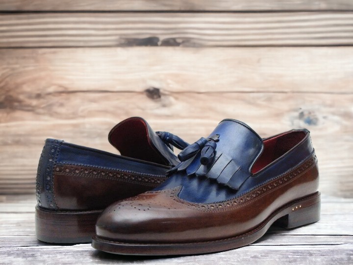 Handmade Men's brown and navy blue Leather Wing Tip Brogue Toe Kiltie Tassel Loafer Shoes